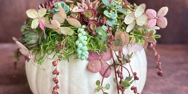 Potted Succulents: Mist succulents with water every 7-10 days or remove your pot to bottom water. Avoid soaking or pouring water directly into the pumpkin — too much moisture will cause it to rot. Your pumpkin can last 4-8 weeks or more, depending on temperature and moisture. Once your pumpkin begins to soften, simply remove the pot & put it into a decorative one for continued enjoyment.